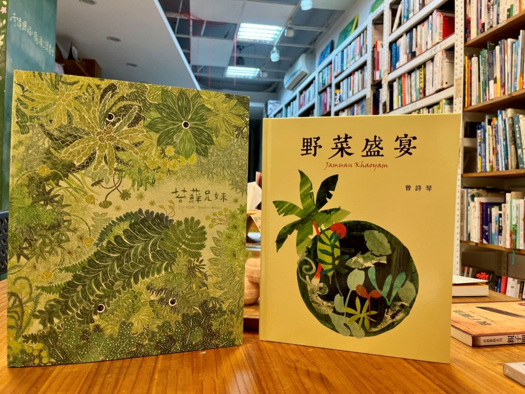 《野菜盛宴》也是台灣自製書,卻充滿異國風情,除了有馬來文對照,野菜拌飯有馬來蝶豆藍染也有泰國蝦醬版,原來作者原生接近泰國的馬來西亞吉蘭丹,高中畢業後來台落地生根。野菜一直是店長選書關鍵字,加上拼貼風格,真是太有趣了!