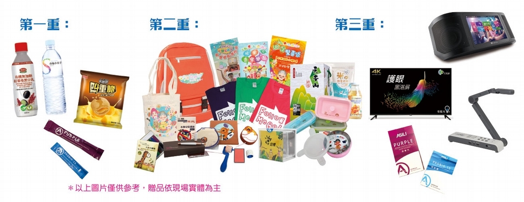 第三重:將完成4枚過關獎章上的抽獎聯完整填寫後,投入服務台抽獎箱,就有機會抽中由金嗓科技提供SUPER SONG 100乙組(價值42,500元)共2名、BenQ贊助50吋液晶電視乙台(價值16,900元)共2名、圓展科技提供AVer M15W 無線實物攝影機乙台(價值16,900元)共1名、ASILI 愛希麗活樂代及佰益菌組合乙份(價值2,875元)共5名…等多項好禮。