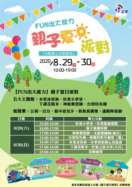 為推廣公視兒少品牌,特別集合旗下兒少節目舉辦「FUN出大能力─親子夏日派對」,每個節目推出一個「主題館」,將節目特色融合在互動遊戲中,讓兒童從玩樂中學習知識與認識自我能力。
