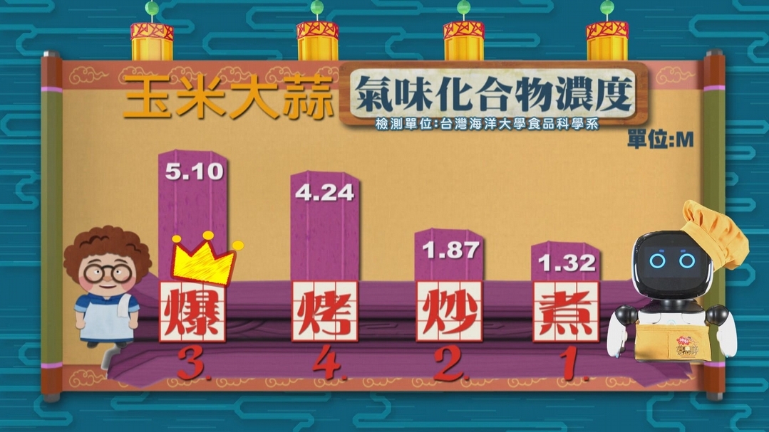 前面講到了「爆香」,以大蒜為例,用油爆之後香味立刻變得很明顯,而且蒜頭反而也不辣了,這是因為大蒜裡面的大蒜素會隨著高溫而被破壞掉分解,辣度就會降低,加上很多的芬芳物質會因為高溫而揮發出來,根據《神廚賽恩師》請海洋大學食科系所做的報告,先油爆大蒜再拌入玉米粒所含的氣味化合物的濃度最高,烤味居第二,炒和煮就明顯低很多。