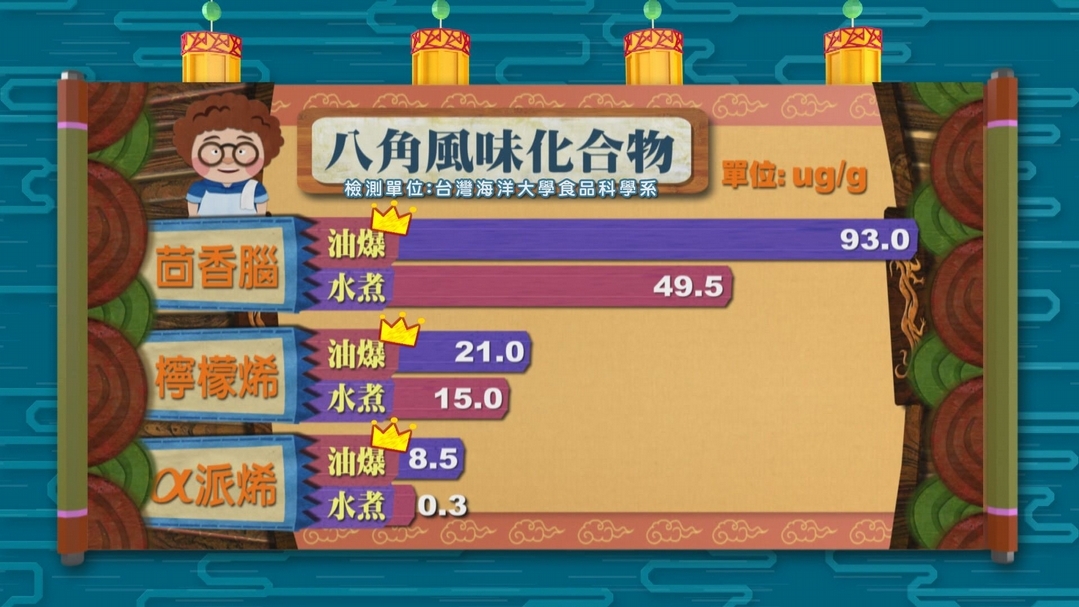 為什麼油爆的香味比較豐富呢?因為水煮的水溫最多就是100度,但油爆的溫度可以達到120甚至到150,這當中化學反應的速度是不一樣的,像是常常拿來滷的香料「八角」,其實如果拿來油爆的話,其中百分比佔前三高的風味化合物「茴香腦」、「檸檬烯」和「α派烯」也都是顯著地比水煮來得高,那為何八角更常見被用於滷的方式呢?這是由於油溫太高,爆香的食材容易焦掉,像八角這種比較耐煮的食材,就很適合放在水裡面,讓它的香氣慢慢釋放喔!