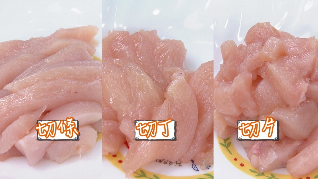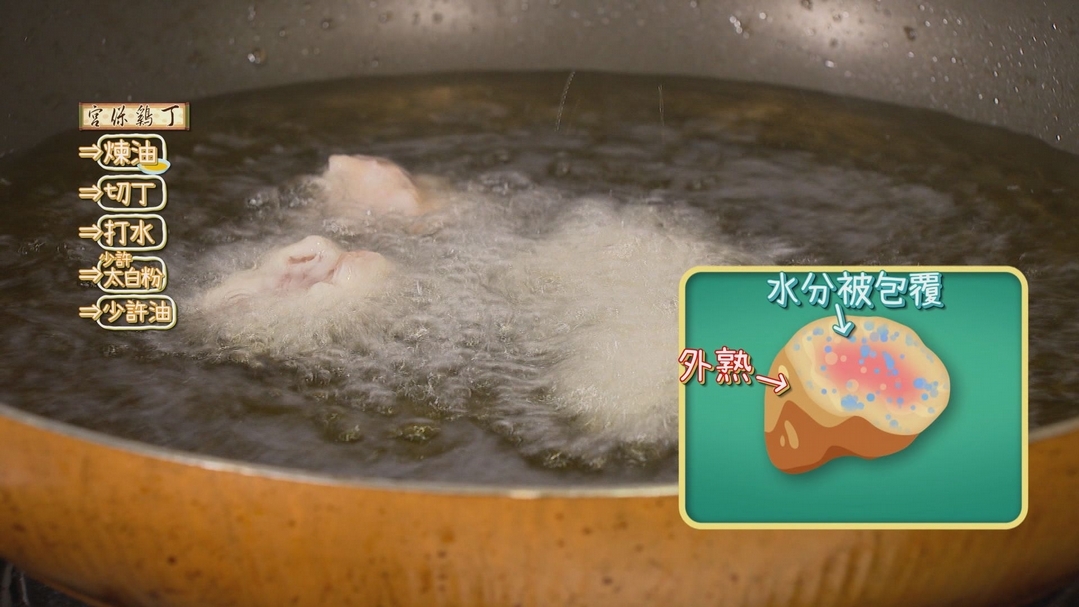 接下來就到了「斷生」這個階段,火力一定要大一點,直接用高溫讓雞丁內部的熟成是八分熟至七分熟,斷生之後切開做比較,就會發現有吃水的雞丁紋路比較細唷~最後,終於要來「爆」一下啦!這時候需要產生一個「鍋氣」,鍋氣就是熱、快、乾、香,而且用圓底鍋,油才能匯聚在一起,溫度較高,才能接觸到比較多的火焰,並迅速地爆炒。