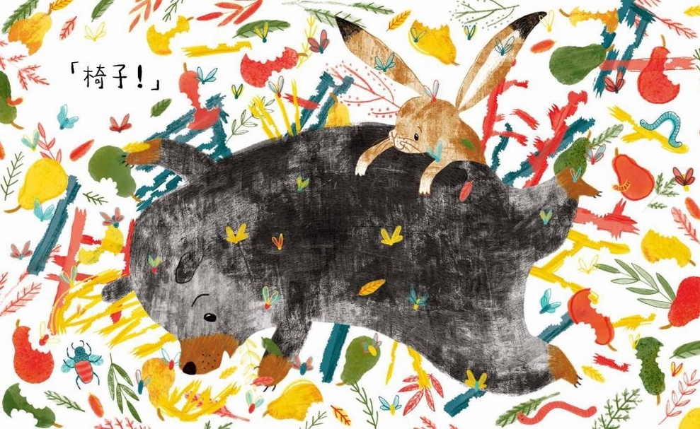 整本書的畫面色彩鮮麗,輕鬆愉悅,即使不公平都很難生氣!而故事背景設在秋天,果實成熟的季節裡,有紅、黃、綠的層疊交替,呼應了分享的季節。插畫家在視角上,一開始用平視的角度,可以看出他們在體型上的差異;如果從樹梢往下看,熊與兔子則是平等的尺寸;紅黃綠三顏色與三位主角在行動與想法的穿插變化,配合視角的轉動,巧妙的安排讀者在不同角度閱讀圖像與故事。