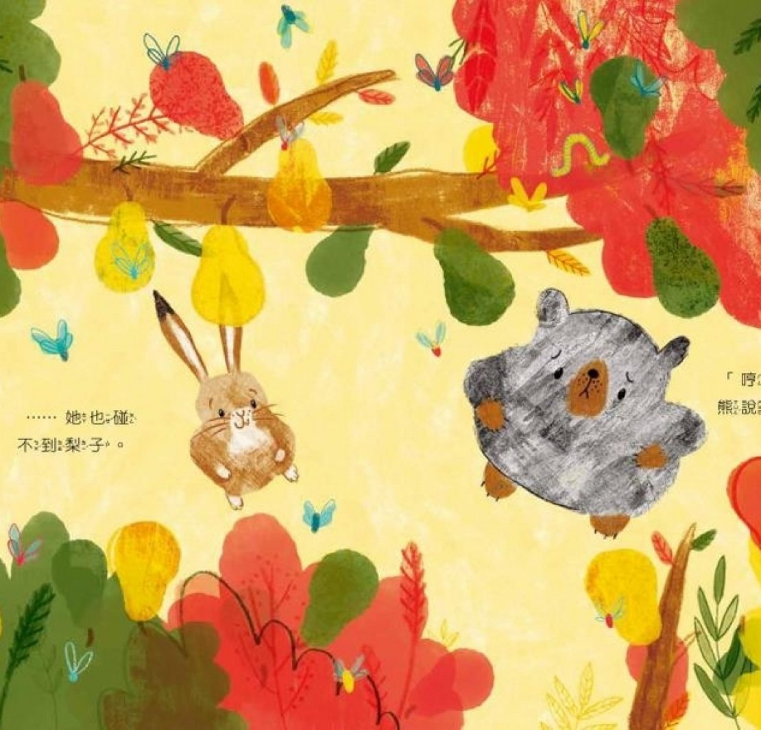 作者皮帕.古哈特擁有精湛的文字能力,至今已出版近百本童書,若有機會閱讀《這樣公平嗎?》的英文版本,便能感受其中Hare(野兔)、bear(熊)、pear(梨子)、chair(椅子)、fair(公平)、share(分享)這些文字串起的韻律與樂趣。