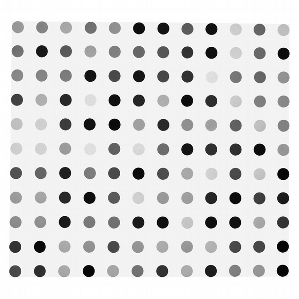 這是他的點系列spot series。我看書中的圖會有種律動的錯覺,這樣規律的畫在表達什麽呢?其實這畫裡的顏色沒有一個是重覆的,每一個灰階都有細微差異。這類型的抽象畫,當代藝術的關鍵字是Abstract expressionism或像是Agnes Martin的畫。