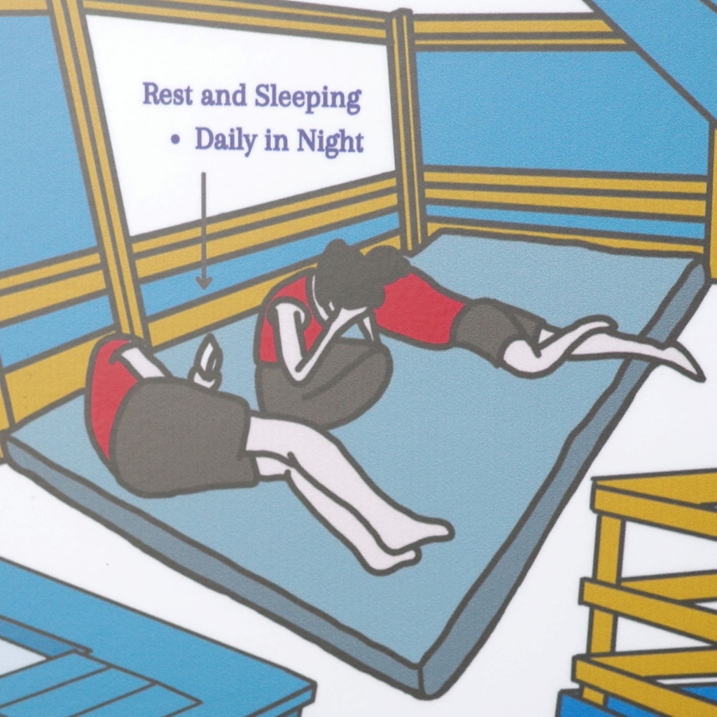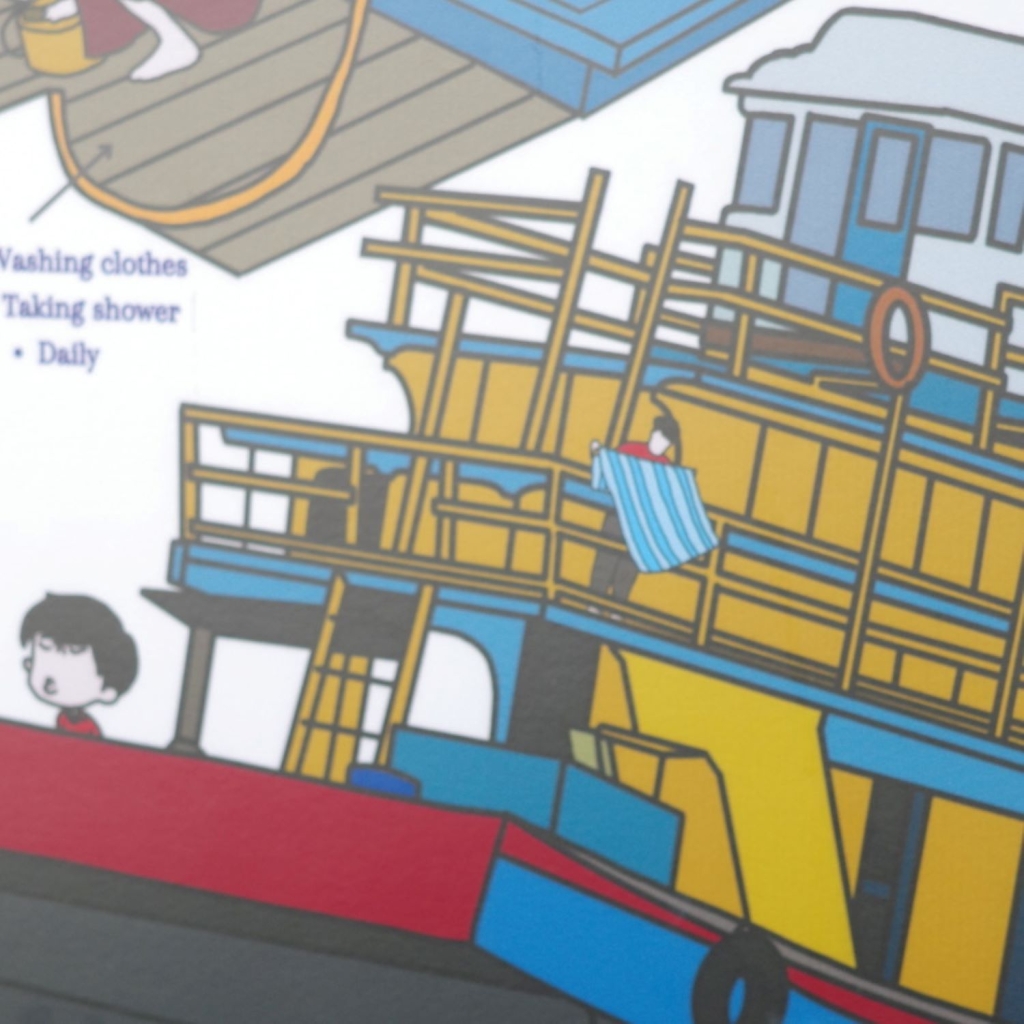 我對這六份展板的「畫風」吸引,有圖鑑式的介紹、有漫畫感的幽默,「該怎麼編織繩網」「漁場是怎麼建造出來的」「漁場有那些設備呢」「造船工具」「你想知道漁民的海上生活是什麼樣子呢」,畫風多樣,內容也都非常珍貴有趣!