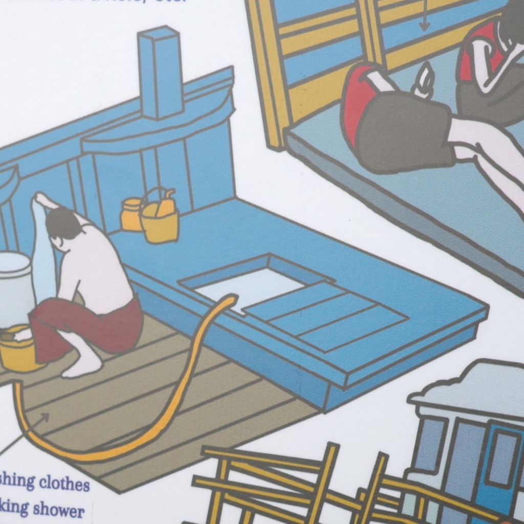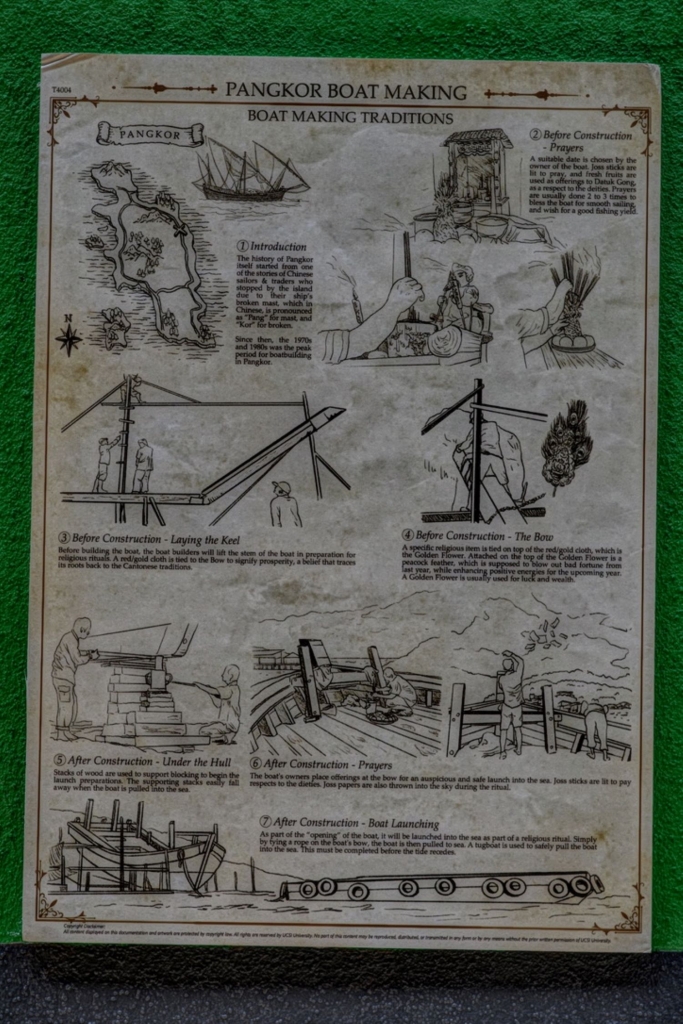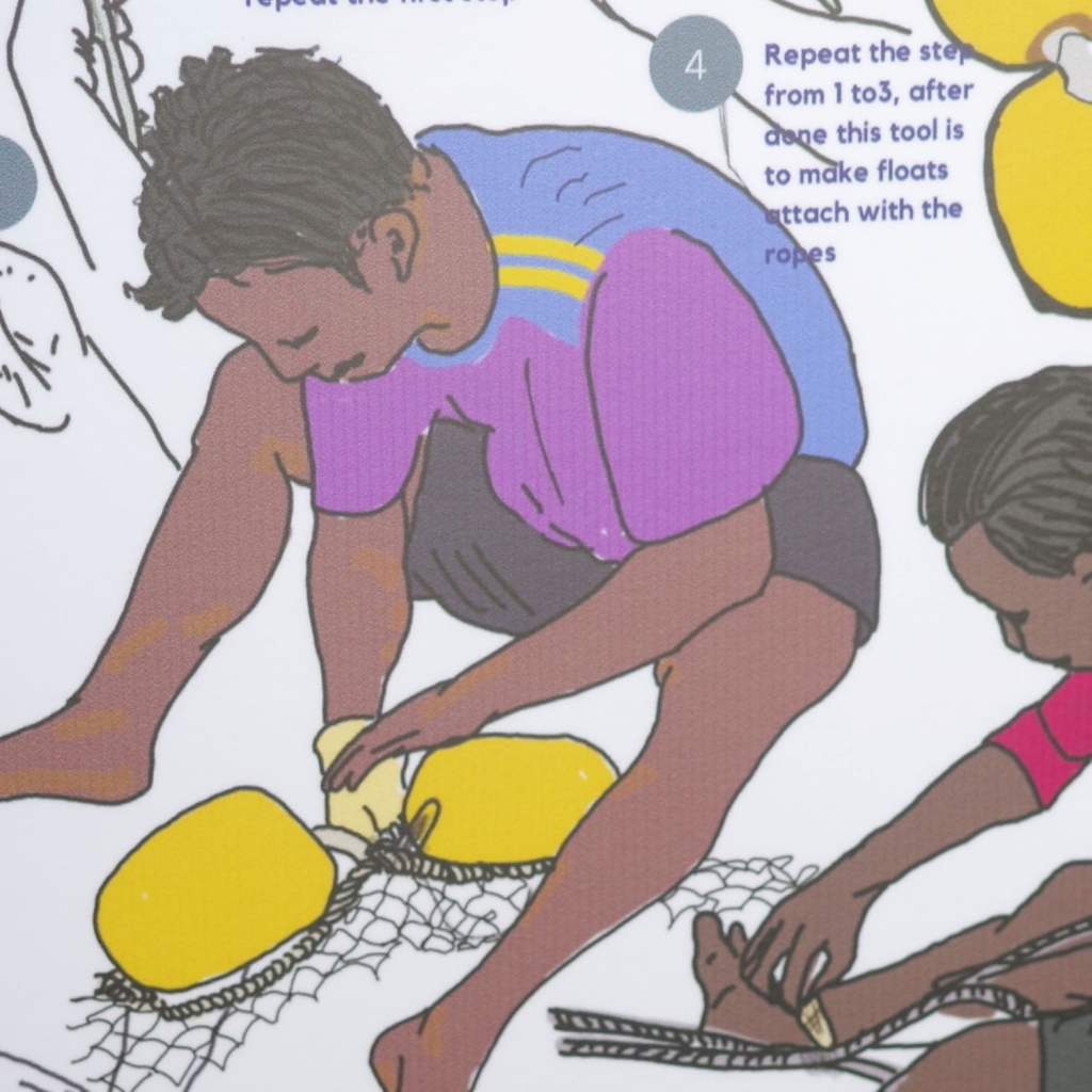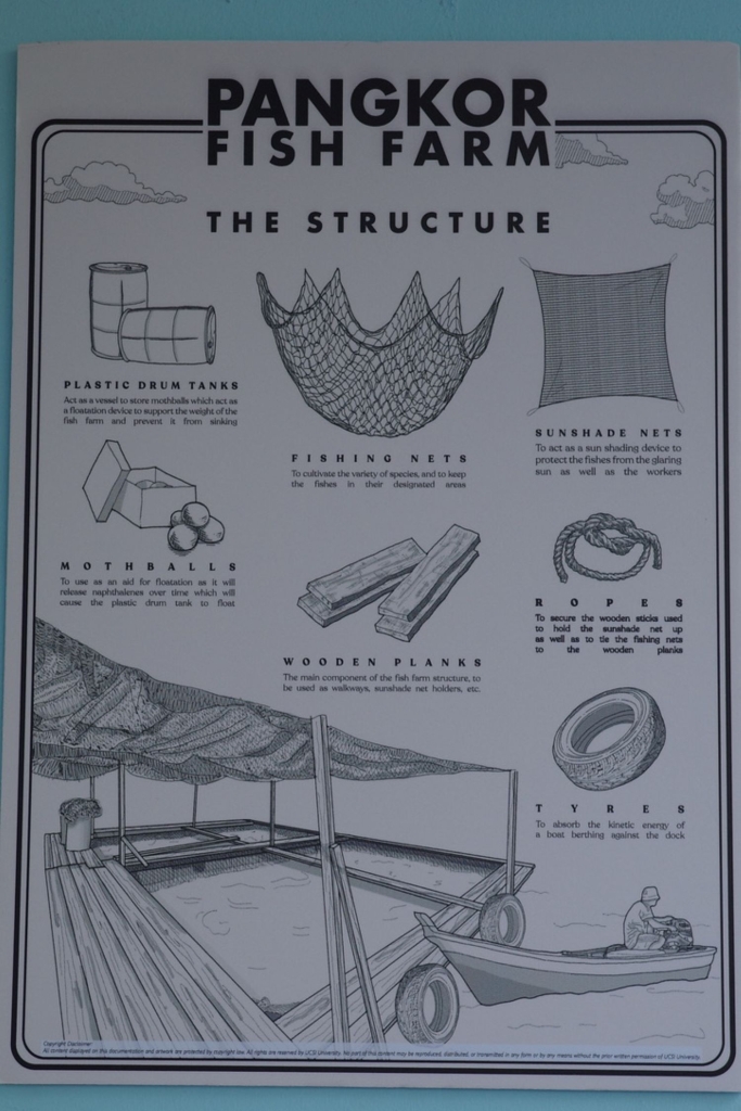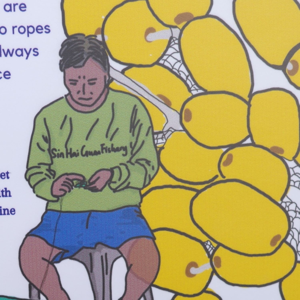 這幾天,我在島嶼上,繪本魂在體內嗶嗶叫,是因為遇到了一系列非常適合做成在地知識性繪本的圖像作品——一系列展版「邦咯島漁業貿易檔案展」(6 Documentary on Pangkor Fishing Trades ),由吉隆坡的思特雅大學建築與環境學院師生(UCSI :School of Architecture & Built Environment )和深耕小島的建築師設計師創建的Platz Studio再造社合作,根據他們在島上一個名為吉靈丸的村落所做的產業調查,然後再將它們一一張貼在藝術節發生的地域,其中包括了捕撈方式、漁場、編網型態、魚種內容。