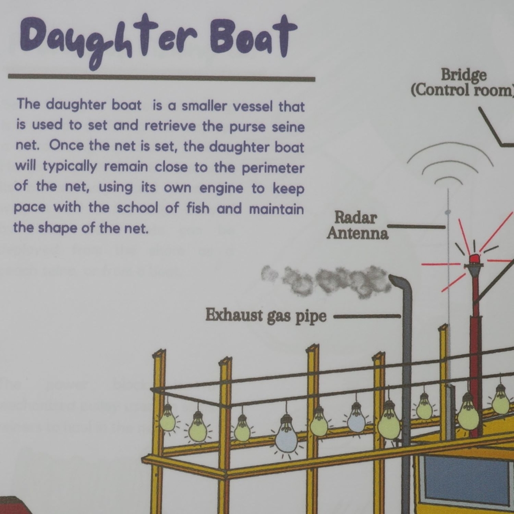 聽到社區工作者談起與孩子們討論捕撈與環境的關係,會有點困難,一方面想讓孩子們瞭解海洋現狀,另一方面孩子們又可能因爲家中正在用這種方式進行,無法改變現況而有負罪感。我喜歡這樣客觀放在現場讓社區居民看到與討論的圖版,溫柔地去展示而留下餘地,讓居民有機會去知道而能決定守護什麼,成為改變的力量。