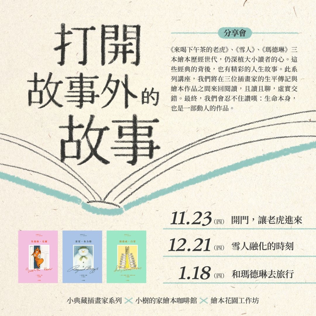 2023年秋天,我受小典藏邀請,在高雄「小樹的家繪本咖啡館」舉辦三本傳記的分享會,名為「打開故事外的故事」。11、12、1月各一場,我希望用有趣活潑的方式把插畫家傳記和繪本作品穿插介紹。這三位插畫家生平最重要的關注是什麼?這些關注如何呈現在繪本作品中?身為說書人,我又如何能再現創作者的核心精神,將之傳達給讀者?