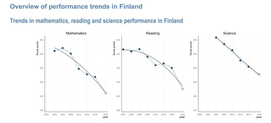 從西元2000年開始,芬蘭在PISA測驗屢創佳績,獲得了世界教育第一的美稱,讓這個北歐小國被視為世界教育典範,湧入了世界各地的教育參訪團,每次的教育改革都成為各國的學習榜樣。不過近年來,芬蘭的PISA成績每況愈下,學生學力下降。在去年底最新公布的PISA2022結果,芬蘭的分數再度直線下滑,且下降的幅度高於OECD國家的平均值,報告公布後,芬蘭國家教育局直言:「這個情況非常令人擔憂」。