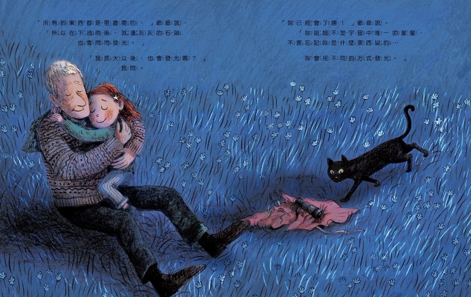 書中有一景,爺爺蹙著眉,表情混帶著愛與憂慮,看著前方抱膝獨坐、仰望星空的小孫女。或許在每個孤獨無解的夜晚,我們身後都有一位這般守護的天使,天使與我們分享天地宇宙的知識,萬物所處,人與人的連結,生命的起源。