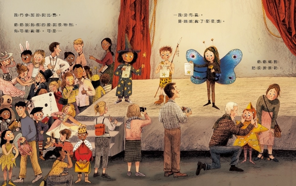 比較的「對象」出現了。小女孩因為和對象比較而感到低落孤單,也許她心中某個時刻也曾閃現:「這樣公平嗎?」這麼一句話吧!幸好,她有一位時時關注她的爺爺,每當爺爺出現在畫面中,你會發現,他總是溫柔注視著小孫女。