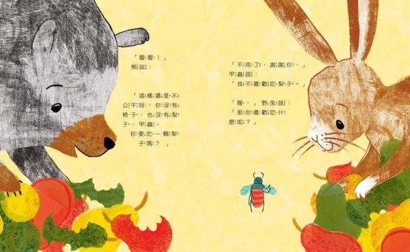 這時,來了一隻甲蟲說:這樣不公平!到底這樣才能公平呢?公平和分享,都需要好好思考一下……。(《這樣公平嗎?》內頁)