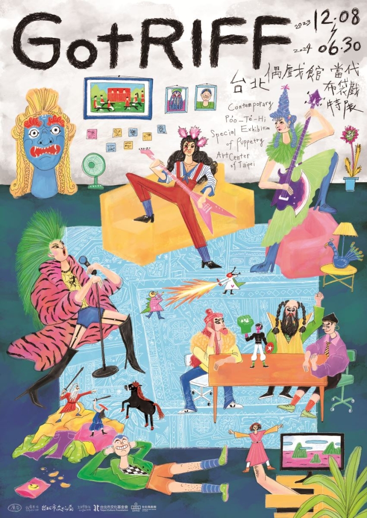 手繪十足活潑的畫風,讓人一時還無法將海報與展覽畫上等號,2023年底的展覽「Got RIFF _ 當代布袋戲特展」的主視覺乍看以為是地下樂團表演海報,不過定睛一看會發現箇中巧思。