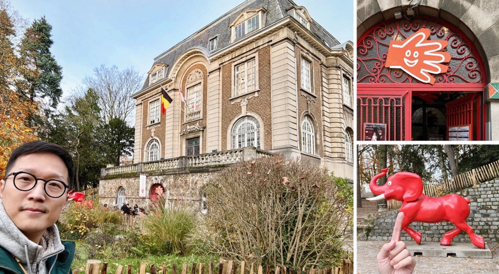 從城市的最高點;也是研討會舉辦地的藝術之丘(Mont des Arts)比利時皇家美術館出發,乘坐公車大約25分鐘,沿途欣賞從精緻的新藝術裝飾建築群,過渡到可愛的住宅區的風景。下車後再走一小段上坡路,就能見到坐落在一大片花園中的那座「宅邸」─布魯塞爾兒童博物館。乍一看,很難確定這座宅邸就是一個充滿無限可能的孩子王國,直到我看到那個大紅色的象頭馬身雕塑,以及那個熱情的「Say Hi」博物館標誌。
