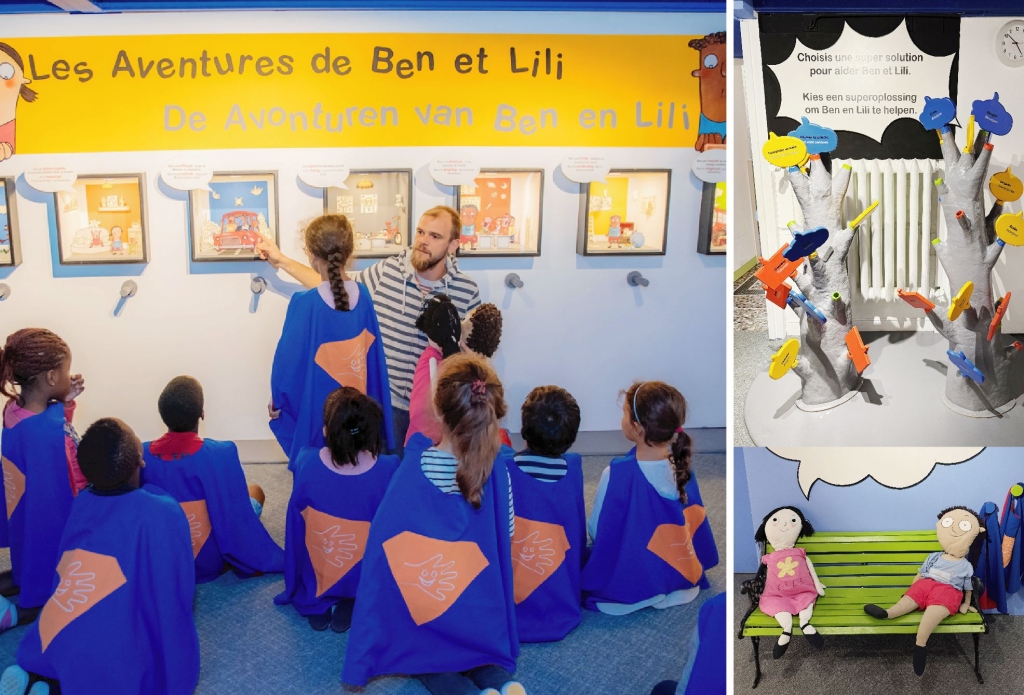 一樓的「超級英雄」展區中,每位孩子被邀請穿上超級英雄的披風,一同探索「班和莉莉」這兩位小朋友在成長過程中遇到的困難,並幫助他們找到解決方案。例如,當班轉到新學校上學感到緊張時,孩子們可以從「超級解決方案」中選擇如「陪他聊天」來幫助他緩解緊張情緒,從而提供孩子們同理心的培養以及面對未來類似困境的討論和練習機會。