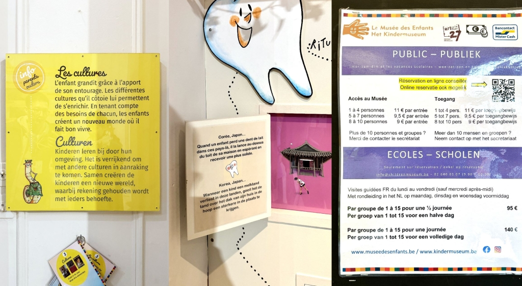在觀察到文宣、指示設計時,就不得不談到比利時的文化多樣性。比利時的文化多樣性源於其北部為荷語區,南部為法語區,而兩者的交接地,即首都布魯塞爾,則是一個雙語區域。全面雙語的指示、路牌行成了獨特的文化風景。這樣的風景在兒童博物館中也不例外,光想到所有的文宣指示都要做三份(含英文)就感到頭隱隱作痛,更不用說多一種語言在排版、配置的美感上是加倍的困難,導覽、活動都必須準備三倍,從設計及營運的角度都不得不致以更高的敬意!