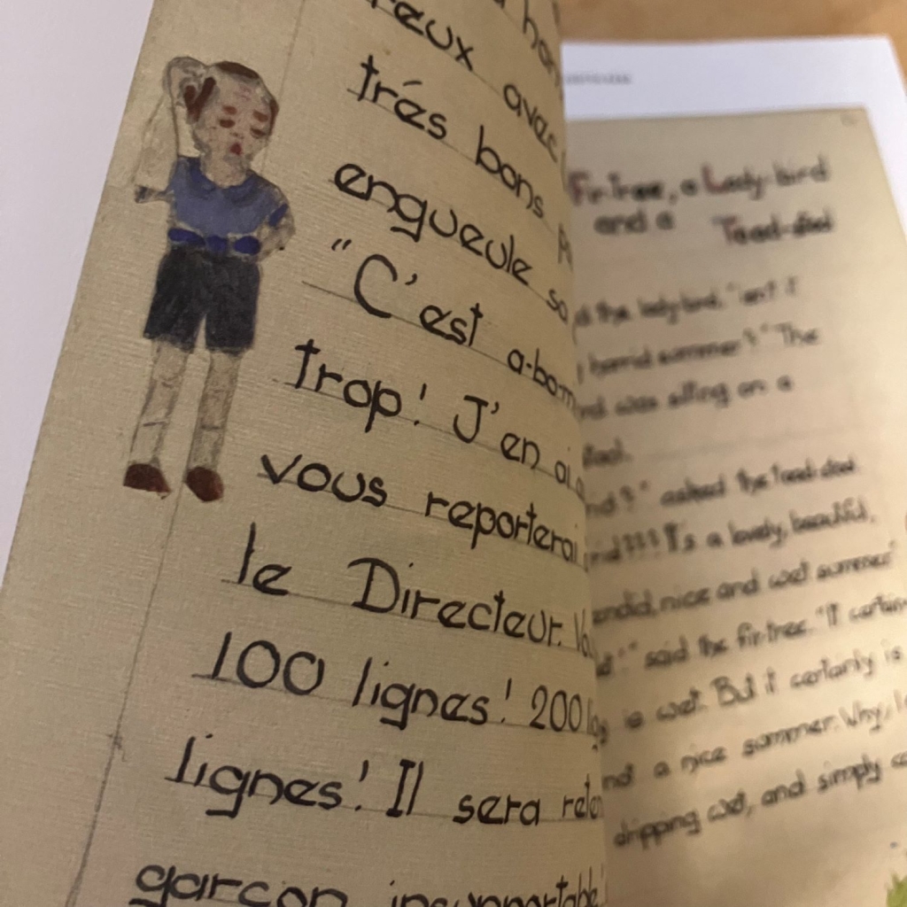 例如我讀到朱迪絲.克爾在1936年抵達英國後,用英、法文夾雜寫成的作文。我想起很多年前曾經記錄下自己看到電影中,她和哥哥向爸媽抱怨又要重新學習開始新的語言了,爸爸跟孩子們可以擁有歸屬感的問題,超越語言本身的歸屬,在她童年的這張小小的作文可以看到,它的秘密在於「能夠書寫自己的故事」,這對於多語言文化環境中的孩童格外重要。