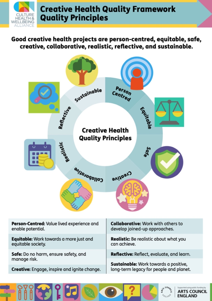 Victoria特別與我分享Culture Health & Wellbeing Alliance最近推出的Quality Framework,這是和200多名創意實踐者、參與者、研究者、倡議者討論的成果,可以讓不同領域的夥伴在規劃健康福祉計畫時有基礎的架構,主要準則有8項:以人為中心(Person centered)、正義公平(Equitable)、安全(Safe)、創意(Creative)、協作(Collaboration)、踏實(Realistic)、反思(Reflective)、永續(Sustainable)。