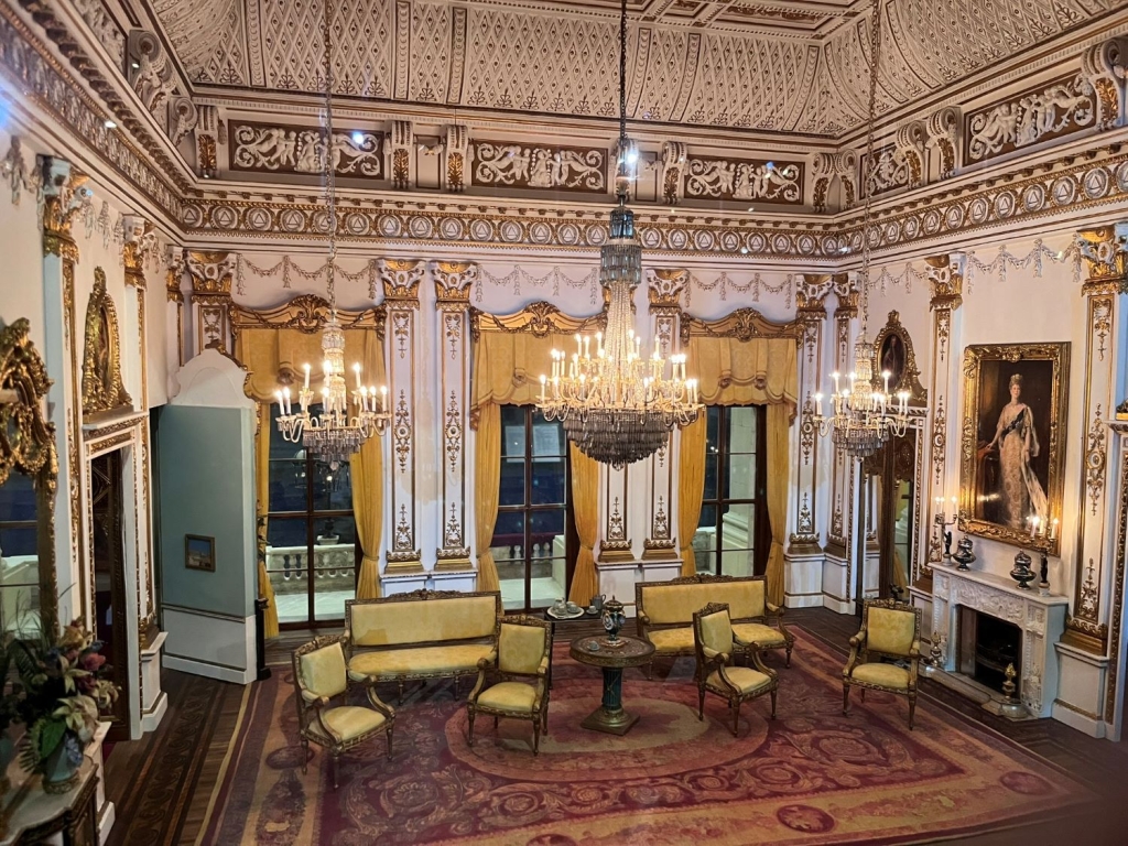讓我們再靠近一點觀察,白金漢宮二樓中央,有著黃色椅子、三個長形落地窗、黃色窗簾的房間,這三盞以真正的水晶製作的吊燈,搭配幽微的燈光,是不是也相當逼真、華美?就連白色壁爐上方的畫作,都非常寫實、有質感。