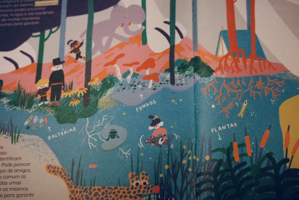 書頁圖畫,是一座小森林,裡頭有各種動植物:大象、菌菇、水草,甚至是小小的細菌!「但當我們講到社群時,指的幾乎是『社會社群』——一群有著共同認同的人。這可能更像是一個『朋友圈』,但在一個社群中,人們彼此之間不全都相識。然後,大家會分享相同的價值觀,並共同努力保障大家的福祉。」