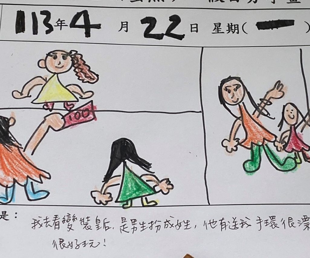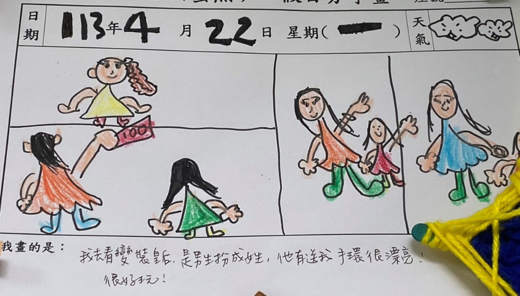 過去我們在共讀許多故事當中,孩子已認識到每個人都能選擇不同的性別氣質、在外也能理解性別友善廁所的存在,在觀賞戲劇表演時,也能明白男扮女裝、女扮男裝都是可以被接受的表演形式。
