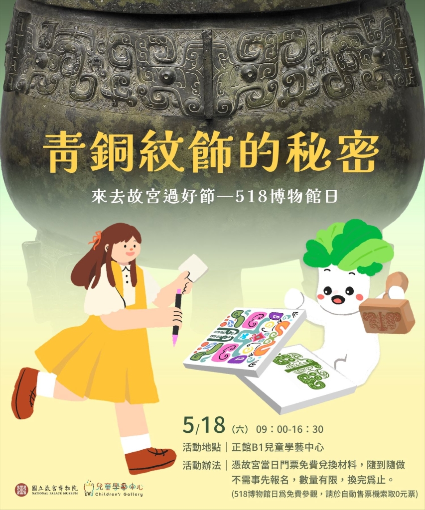 為響應2024年國際博物館日主題「博物館,教育及研究的場域」(Museums for Education and Research),故宮北院擷取青銅器特色紋飾,邀請全齡觀眾主動觀察、研究青銅紋飾,並以手作體驗方式,引導觀眾描繪青銅紋飾特徵,轉化為獨特的紋飾杯墊,讓博物館成為教育及研究的場域。