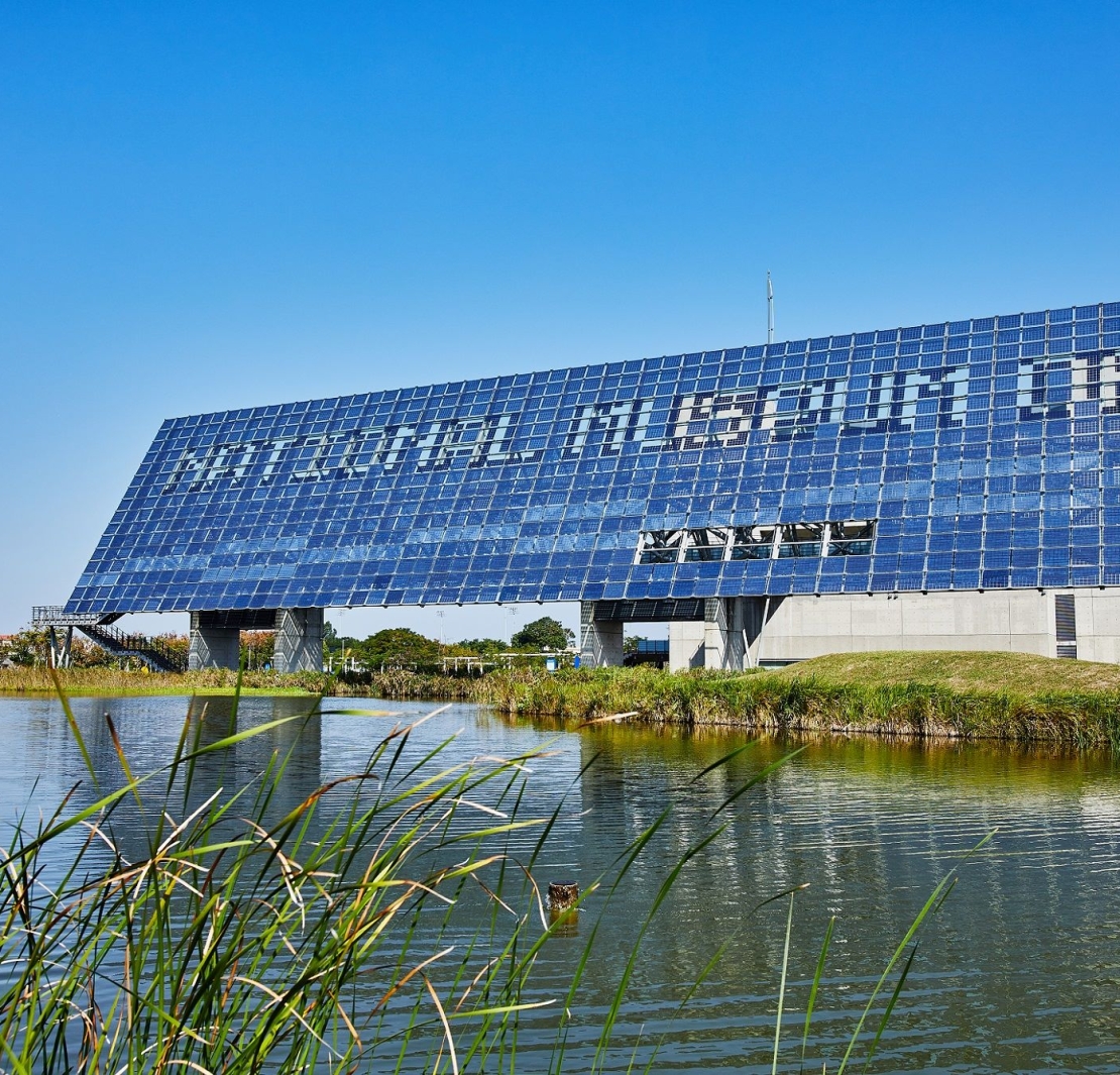 你猜到了嗎?它其實是光電發電設施,由經濟部能源局補助建置,支援著博物館的電力!這片大型雲牆板面是由1,350片太陽能光電板組成;透明的國立臺灣歷史博物館英文字樣「NATIONAL MUSEUM OF TAIWAN HISTORY」使用了405片網印玻璃!每當來到臺史博,總會被這醒目的招牌吸引呢!
