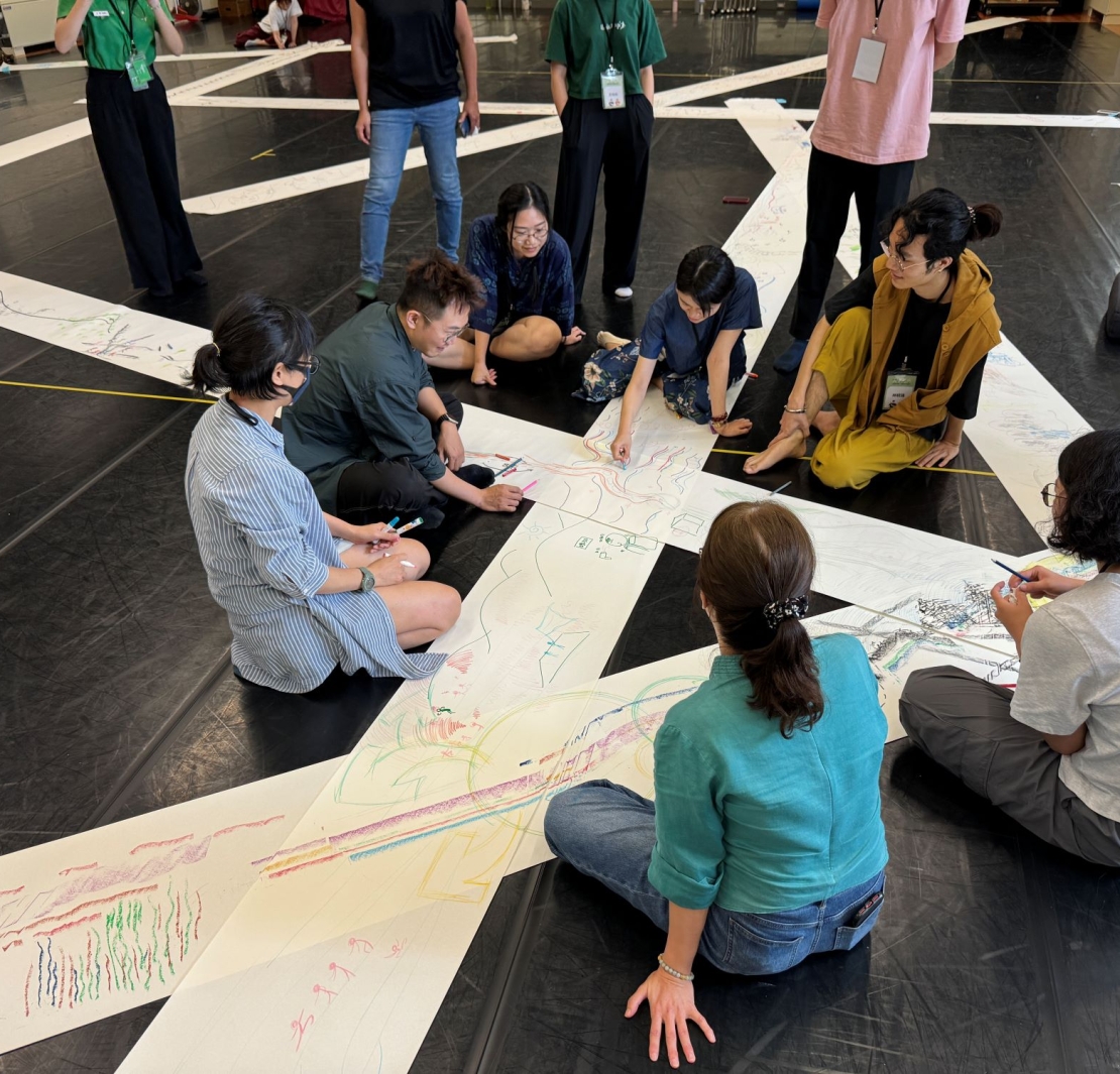 上午走入排練室,學員兩人一組,長型紙捲在空間中隨機鋪設,讓學員從對向畫出來雲門的過程。由於有幾組的紙捲重疊在一起,在交會之處,也自然而然形成溝通、妥協,讓彼此的畫作再向另一端延伸。