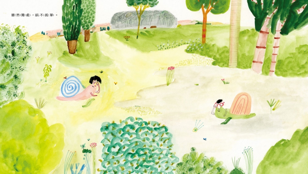《蝸牛美美想獨處》,少有地提到了「重啟內在的空間」,蝸牛美美她躲到花盆底下、大石頭後,遠離人群,進到遙遠的野地。