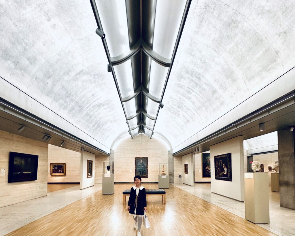 我曾聽人說凡有念歐美建築的人,沒有人沒聽過路易斯.康,而金貝爾美術館更是路易斯.康的經典之作,以建築史上史無前例的天窗系統,和以義大利聖馬可教堂為靈感的拱形屋頂而聞名,讓觀眾們在其中欣賞畫作時,像是穿梭在古典卻又俐落的拱廊中,並伴隨著平均分佈在天花板上所撒下的自然銀色光線。