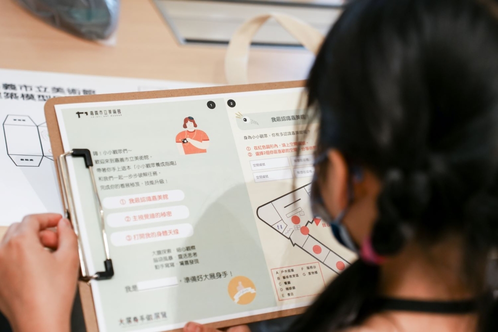 今年(2024年)則更進一步,預計搭配三檔嘉美館的主題策展,進行「小小觀眾養成指南」,招收對象的年齡層也再下調,分為1-3年級的初階班,及4-6年級的進階班。前者聚焦在引導孩子從認識美術館的不同空間及功能,到展覽裡的大小事觀察;後者則進一步從5W1H分析法,思考策展的不同考量,並加入平面設計課,讓學童製作特展的推薦作品指南。