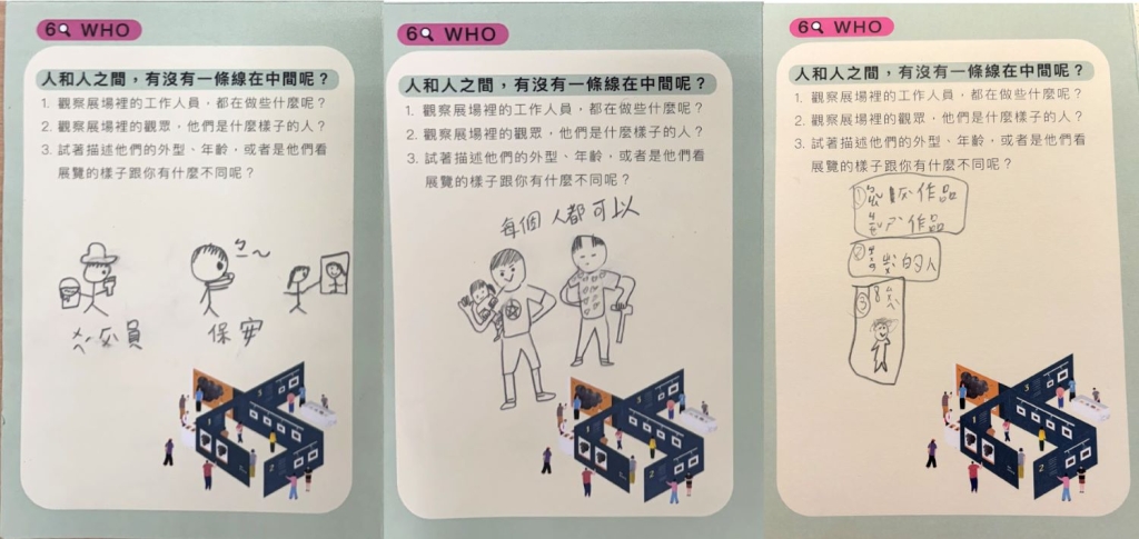 1-3年級的學童,由於國字識字量有限,看著他們在學習單上「畫」出觀察的內容,相較於文字,更能發現細節。也從中發現,相較於作品的感受性,身為觀眾的學童,過去鮮少留意到其他的美術館觀眾或是工作人員,因此在「人與人之間的線」這個問題的討論上,讓孩子們將觀展的關注從藝術品暫時轉向美術館的環境中,也獲得了一些有趣的觀察。