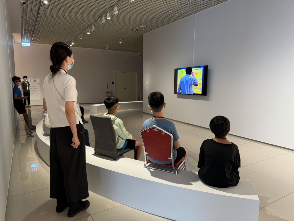 不過進到展場參觀時,儘管前面的策展討論被拋到腦後,多元的作品形式讓學童都沈浸其中。以3F展間黃博志的〈二哥的藍色斑鳩〉為例,前置準備時會擔心對於孩子過於沈重,但在最後的討論中,發現孩子們對於這件作品的感受性很強烈,也耐心在展場遊走,仔細聽著故事。