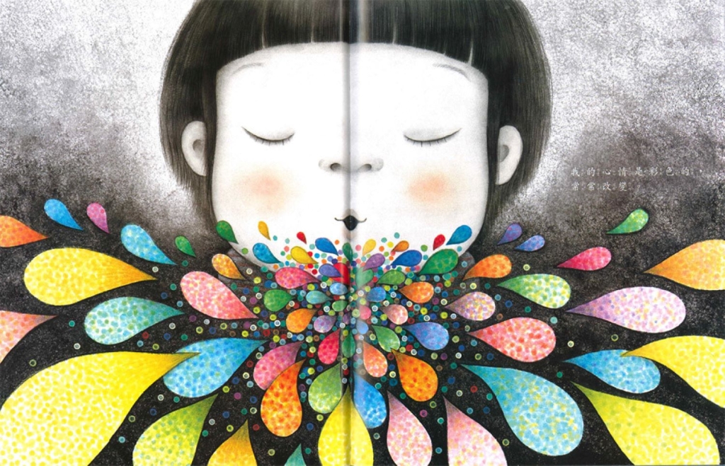 《你的心情是什麼顏色》(上人文化出版)採更為蹲低的方式,與低幼年齡的讀者淺談情緒的顏色。