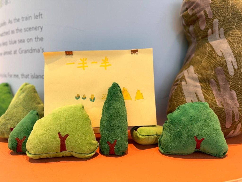 這些抱枕,是由越南、泰國及印尼三地的地方媽媽畫的各種形狀製作而成,聽著頭上音響傳來媽媽唱給孩子聽的童謠歌曲,看著越南語、泰國語和印尼語對照華語的歌詞掛簾,對學了幾年越南語的阿皮、正上完泰國史課的阿皮阿兜來說,這一區充滿「母語(視覺)」、「家鄉味(嗅覺)」、「鄉音(聽覺)」和「媽媽手繪(觸覺)」,是一個「家」的疊加態呈現。