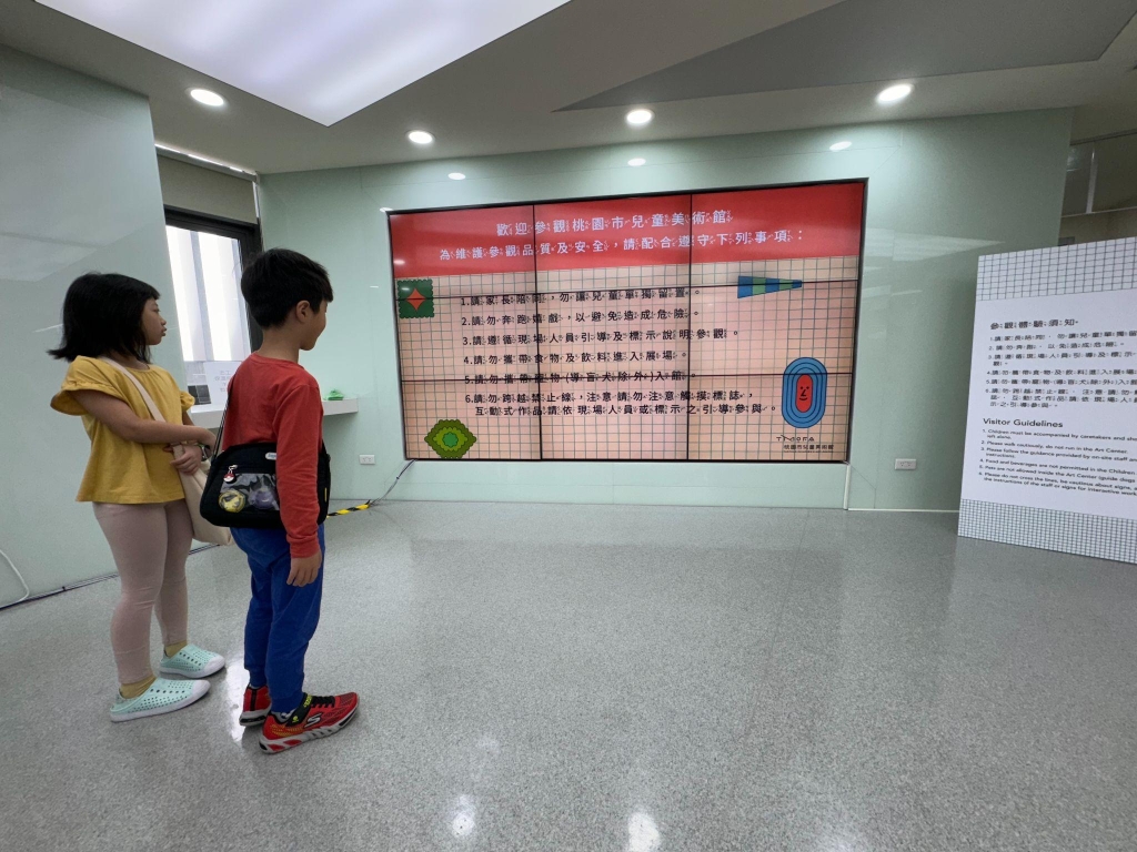 阿皮和阿兜首先自導自玩了一輪,跟著他們一起,我發現他們和幼兒時期強烈依賴多元互動的狀態很大不同;彷彿,長成是「大孩」的他們,已經可以在這一種「議題式展覽」待得比較久,可以自己閱讀,找到自己看展覽的方式;而這樣社會化的方式,也剛巧回應了桃園市兒童美術館在一進入館內時強調的「請勿奔跑嬉戲」、「遵循現場引導及標示說明參觀」、「請勿跨越禁止線」、「注意請勿觸摸標誌」和「互動式作品請依現場人員或標示引導參與」等規則。