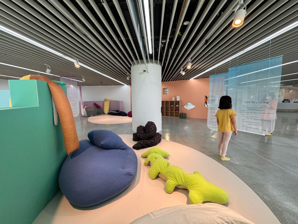 而當阿皮和郁齡說她聽歌謠中彷彿聽見西貢小姐(Miss Saigon)時,郁齡也回應感動好看,在提到是三地的地方媽媽唱給孩子的搖籃曲時,阿皮分享實際上自己舅媽或親戚給表弟聽越南語的 Baby Shark,頓時讓我們對他國移動傳承的鄉愁想像,變得當代現實立體起來,大家笑成一片。而來到說明牆前,看著參與創作的幾位媽媽的名字,阿皮竟開始聊起越南字的哪個拼音要怎麼唸,上面的各種輕重音小符號,幾個大人開始聽孩子說、向孩子學點什麼,透過展覽中發現或延伸的共同點,大人和小孩層層疊疊、漸漸地交起了朋友。