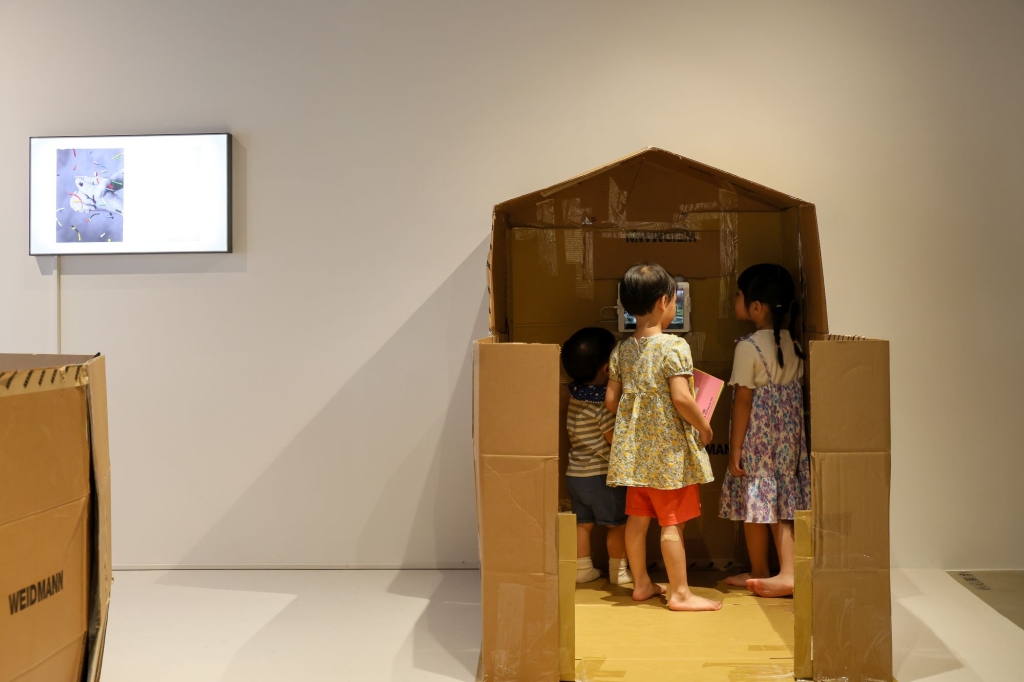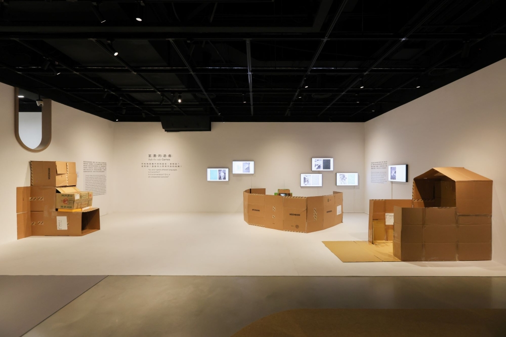 莊普作品〈三位小豬的故事〉利用廢棄的紙箱,像是打造兒童遊戲的秘密基地一樣,表達不同生命經驗和觀念的多樣性。