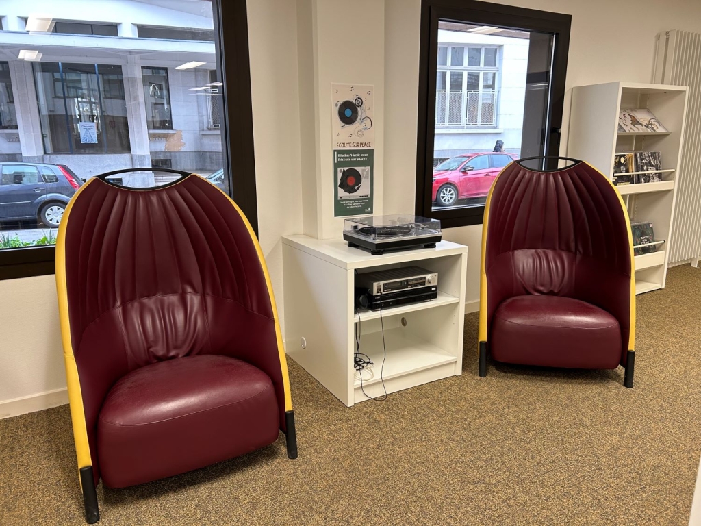 一車車黑膠唱片與鐳射光碟,擺放於一樓入口,靠窗位置有唱盤與視聽沙發,坐在高腳吧檯的館員化身DJ,以旋律佈置輕鬆的閱讀氣氛。