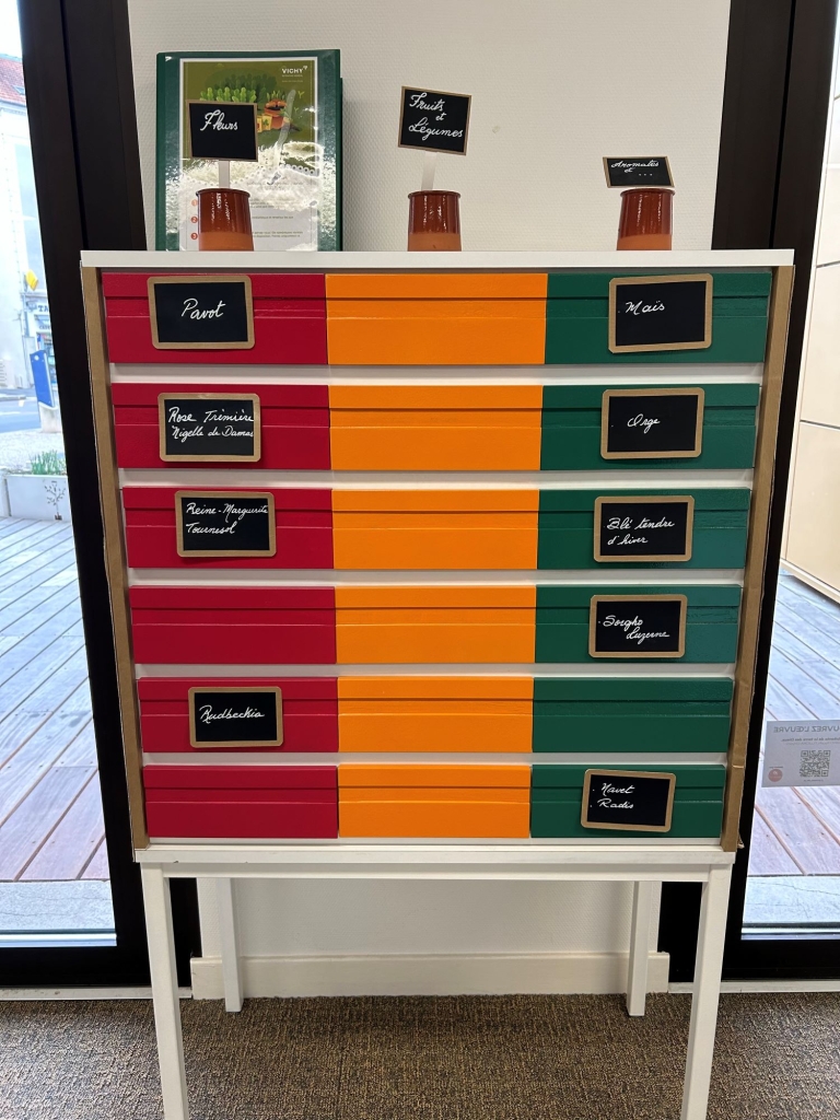一樓還有一處吸引注意:那是一只色彩鮮明的櫃子,不同抽屜外層標示不同單字,忍不住好奇拉開瞧瞧,喔~原來是區分成「花卉」、「蔬果」和「香料」等三種植物的種子,個別包裝後,置於抽屜內,與讀者們分享。