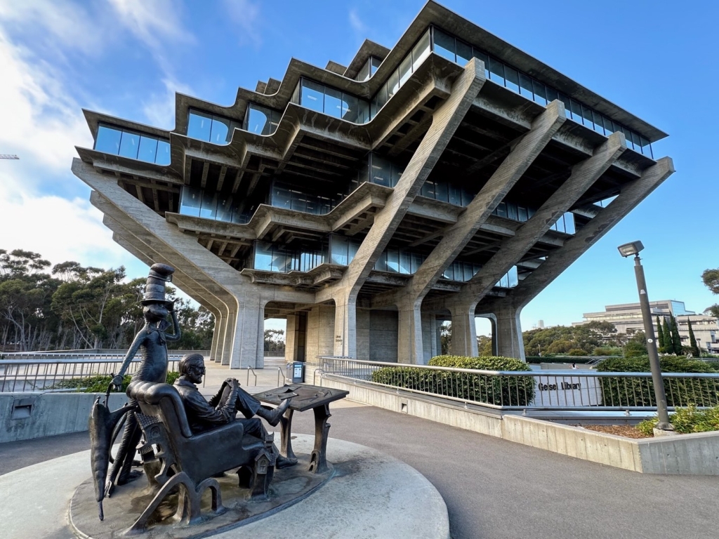 圖書館的建築本身就很值得一看,座落在UCSD的校園中央,這間建於1970年的未來主義圖書館,長得像一艘太空船,也像一顆蘑菇。遠遠看起來上寬下窄,但實際走到圖書館,才發現它入口其實在地下層,露出來的建築物只是圖書館的一部分而已。