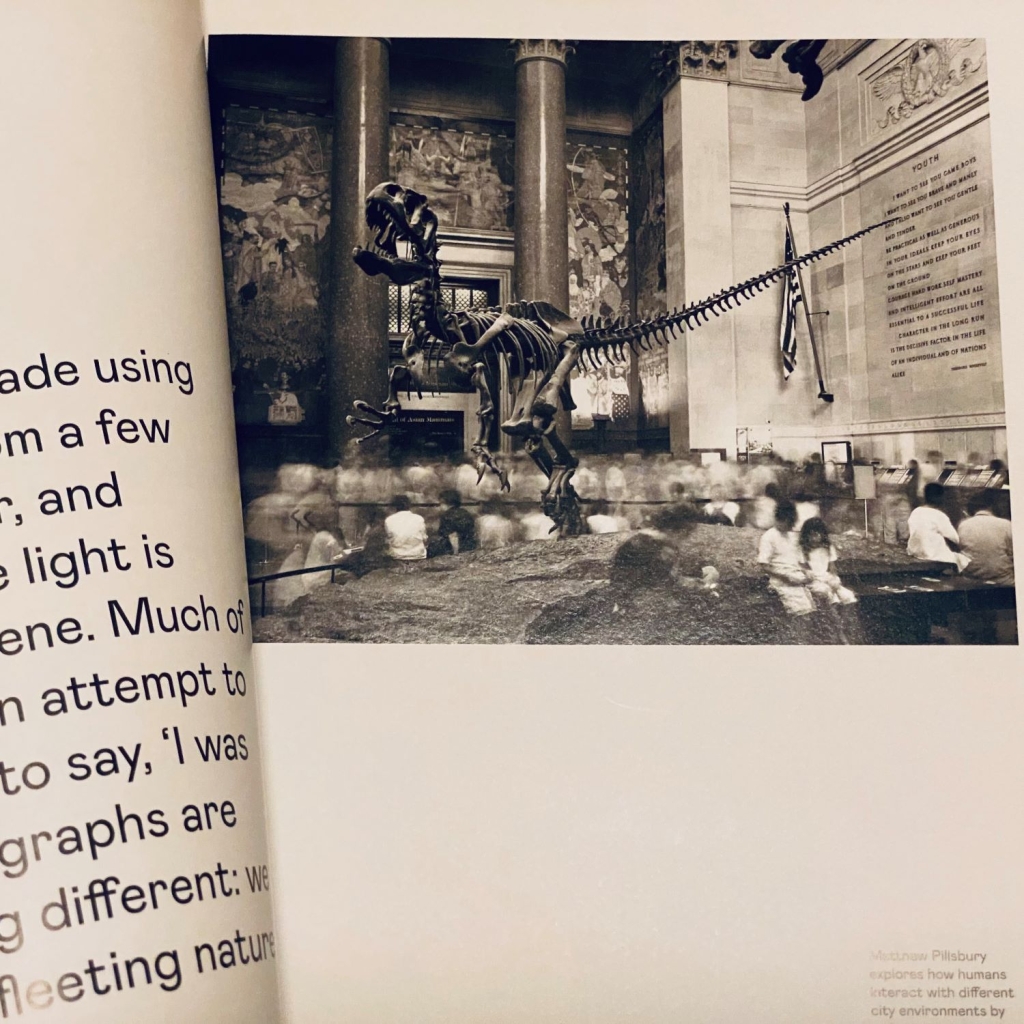 這這本書放的是他在2004年在美國自然史博物館拍攝的一個畫面《恐龍回來了》(Dinosaur Comes to Life),畫面正中間是一隻巨大的恐龍,它底下眾多參觀者因為在長時間曝光而留下身影,就像是恐龍在時間長流奔馳下噴發的沙塵。