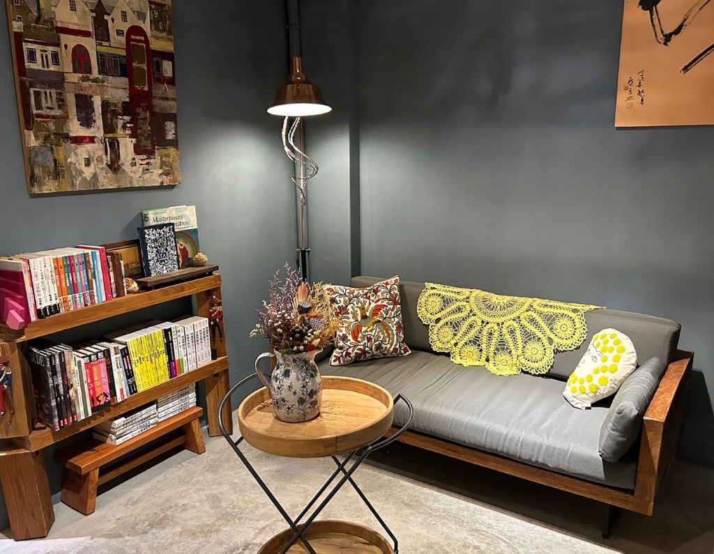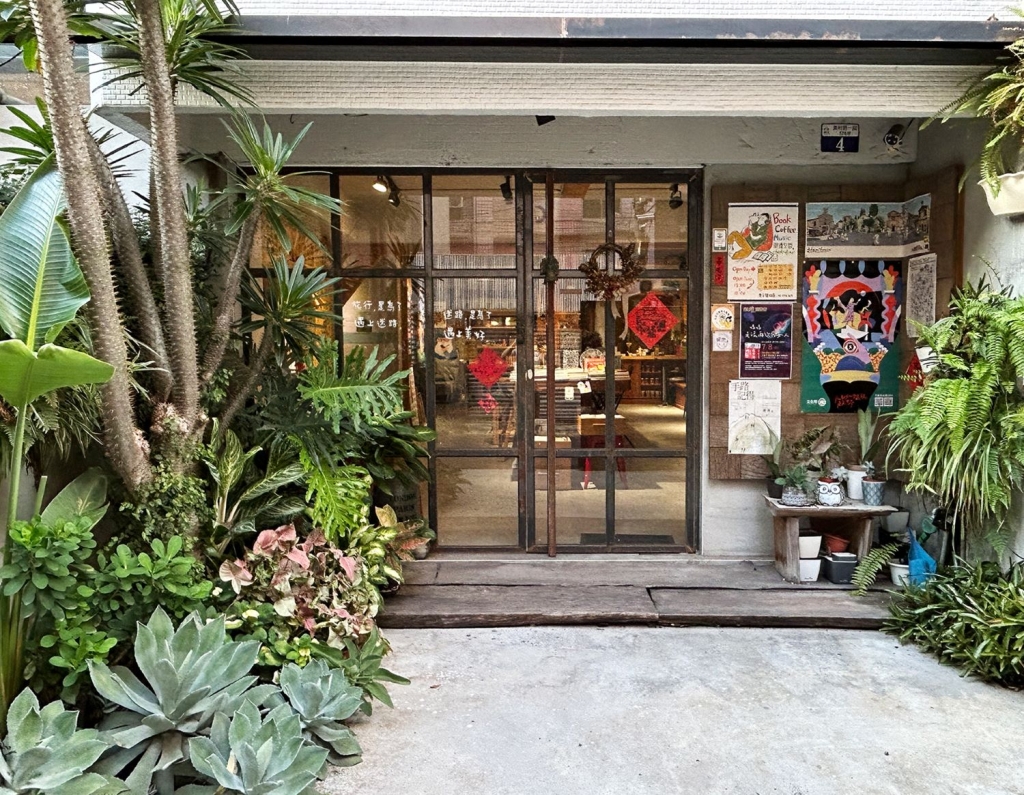 書店門口是綠意盎然、充滿生機卻又低調的開放式小庭院,每當陽光透過庭院灑進屋內,書香花香與陽光交織,讓人彷彿來到遠離喧囂的世外桃源。