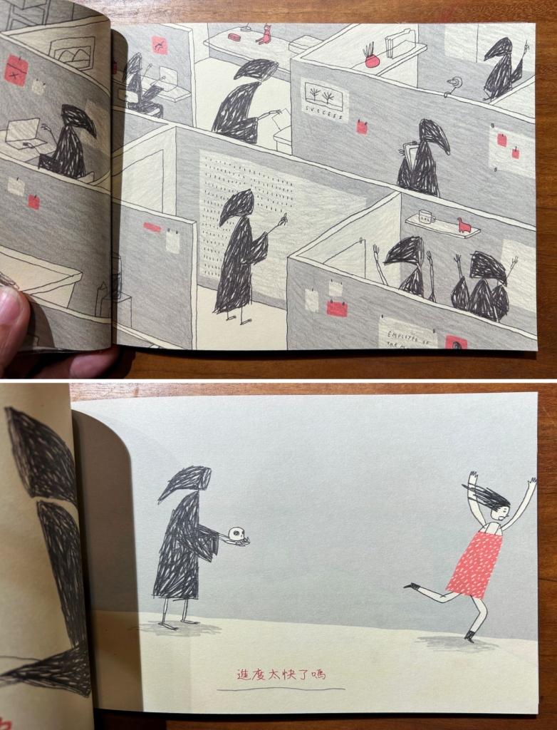透過死神的感受來看休假、生活與工作,格外充滿冷靜的奇幻感。具體來說,是就算當我們放假休息時,還是會焦慮自己「沒在工作」……說到這裡,你是否也點頭如搗蒜?科技快速得讓人們成為疲於奔跑在滾輪中的老鼠,深怕自己被時代淘汰,殊不知自己已先淘汰自己真真實實生活這件事。