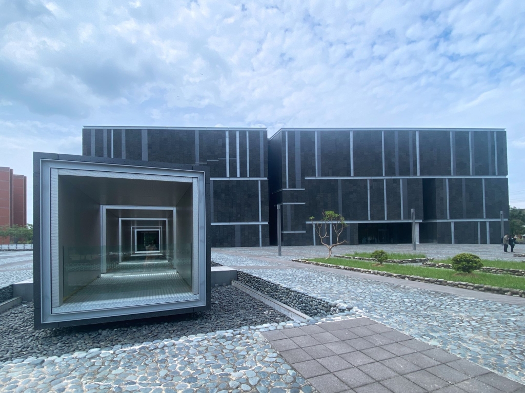 外牆由玄武岩砌成的黑色方塊,也像個黑盒子,等待參觀者打開臺灣的過往,而入口處的黑色玻璃管廊道,正如同時空隧道,帶領我們進入黑盒子、回到過去。