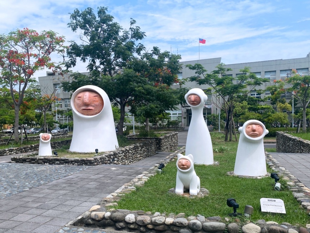 他們是穿越時空的「蔦松家」,有爸爸、媽媽、兩個小孩與一隻狗。臉部形象是出土於蔦松文化道爺遺址的人面陶偶,與本尊對照來看,同樣有著細眼、大鼻子、薄唇,藝術家除了復刻放大陶偶鮮明立體的五官與神韻,還為蔦松家的成員都穿上了如太空衣的白色外衣,如同他們從千年前穿越時空來到現在,也將航向未來。