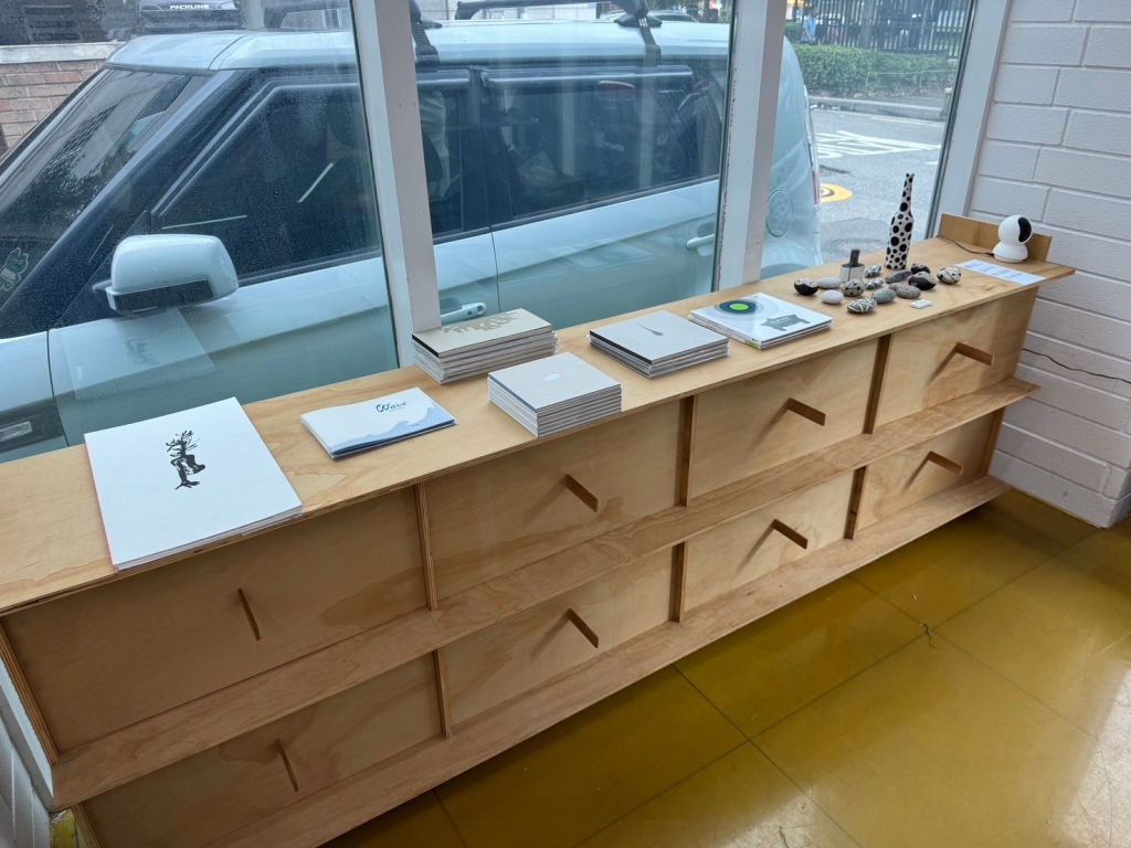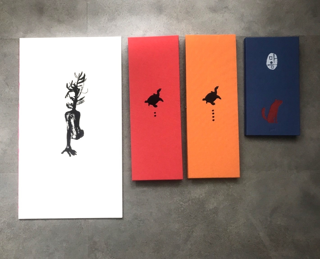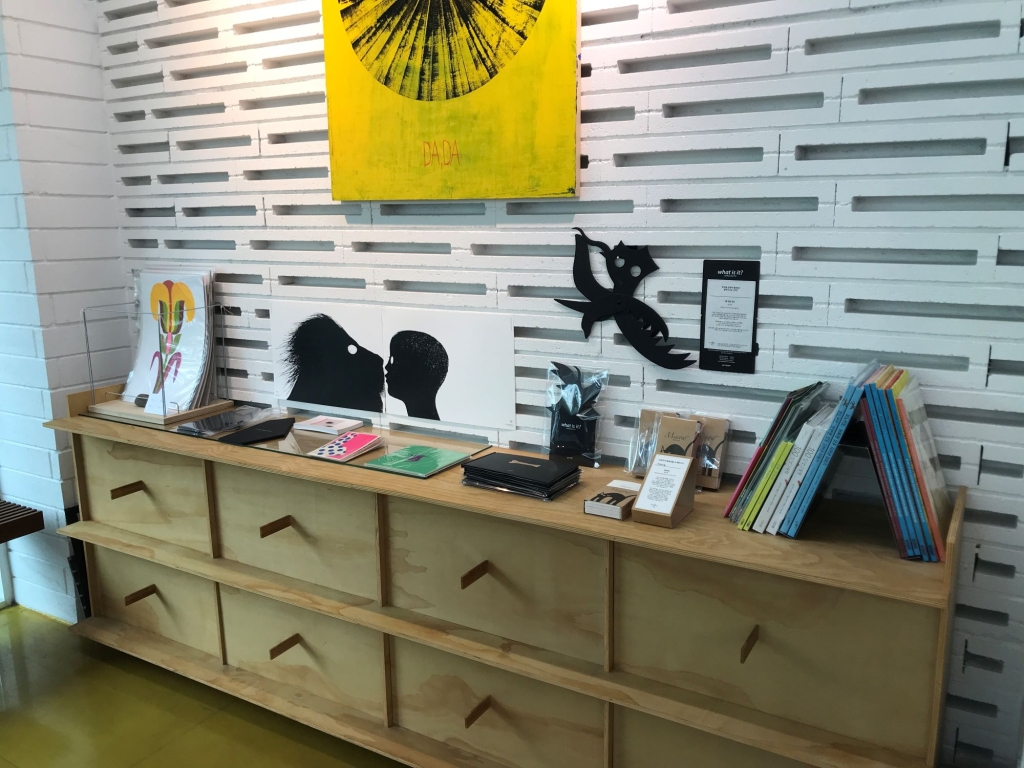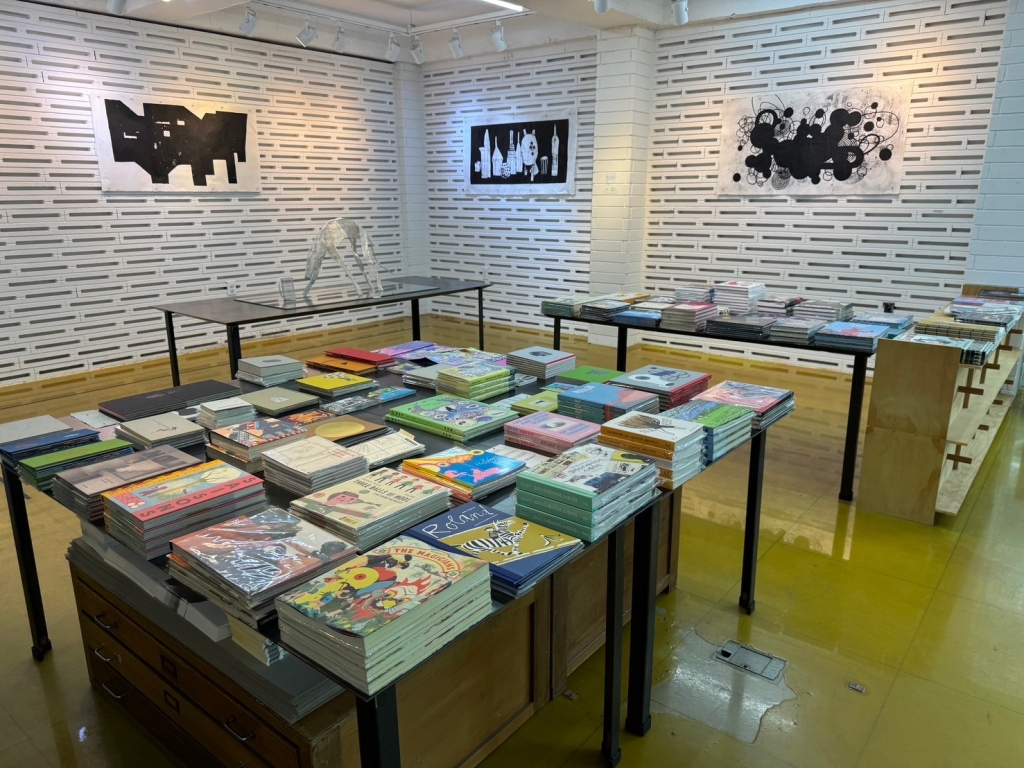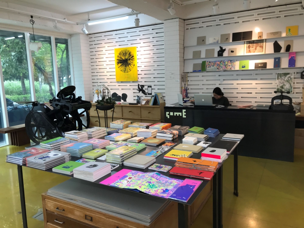 實體書店門口放了兩台早期印刷機,書店最裡面有個小型畫廊,中間書桌及窗抬擺著書。除了自己出版的書籍之外,還擺著其他的藝術書籍和繪本。我們挑了很久,終於滿足地結了帳。