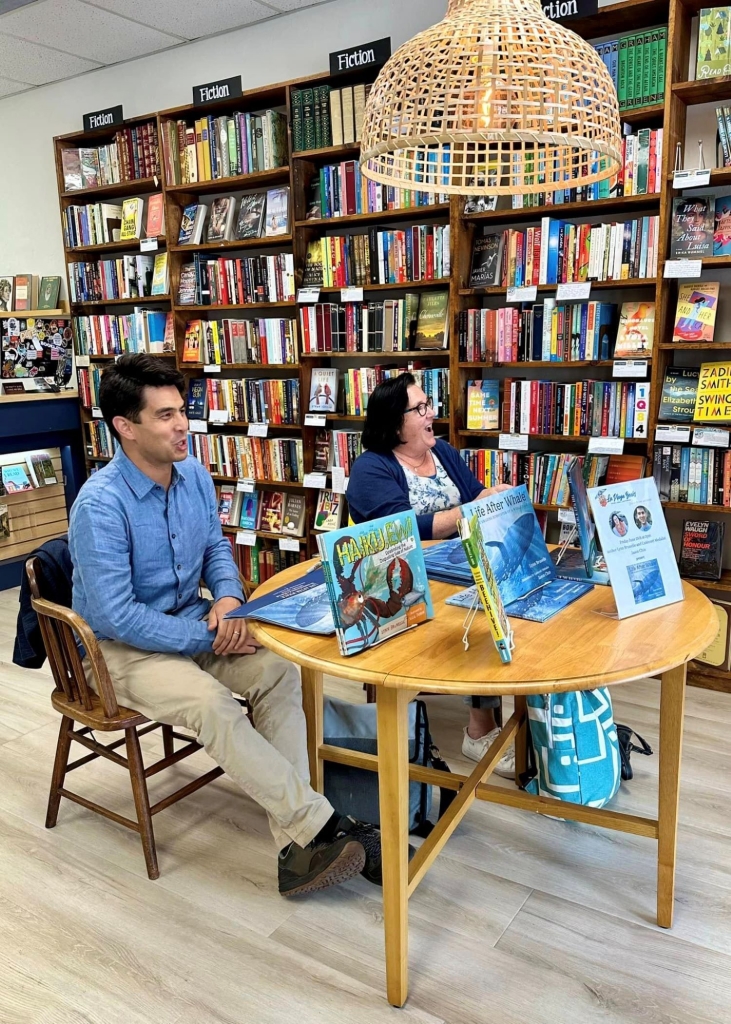 另外,有些作家也會趁著參加研討會的機會,到附近的書店舉辦簽書會,我於研討會開始的前一天,在La Playa Books書店參加了《Life After Whale: The Amazing Ecosystem of a Whale Fall》創作者的簽書會,這本很美的知識類繪本是由四度艾美獎得主作家琳恩•布魯奈爾 (Lynn Brunelle) 和凱迪克金獎插畫家陳振盼(Jason Chin)創作。內容是關於藍鯨死亡後的故事,對海底的生態來說,鯨魚是重要的食物來源,藍鯨的屍體在海底會花上一世紀的時間慢慢被消化,將養分釋放回海洋中,書中介紹這個歷程,和參與分解過程的各種深海動物。