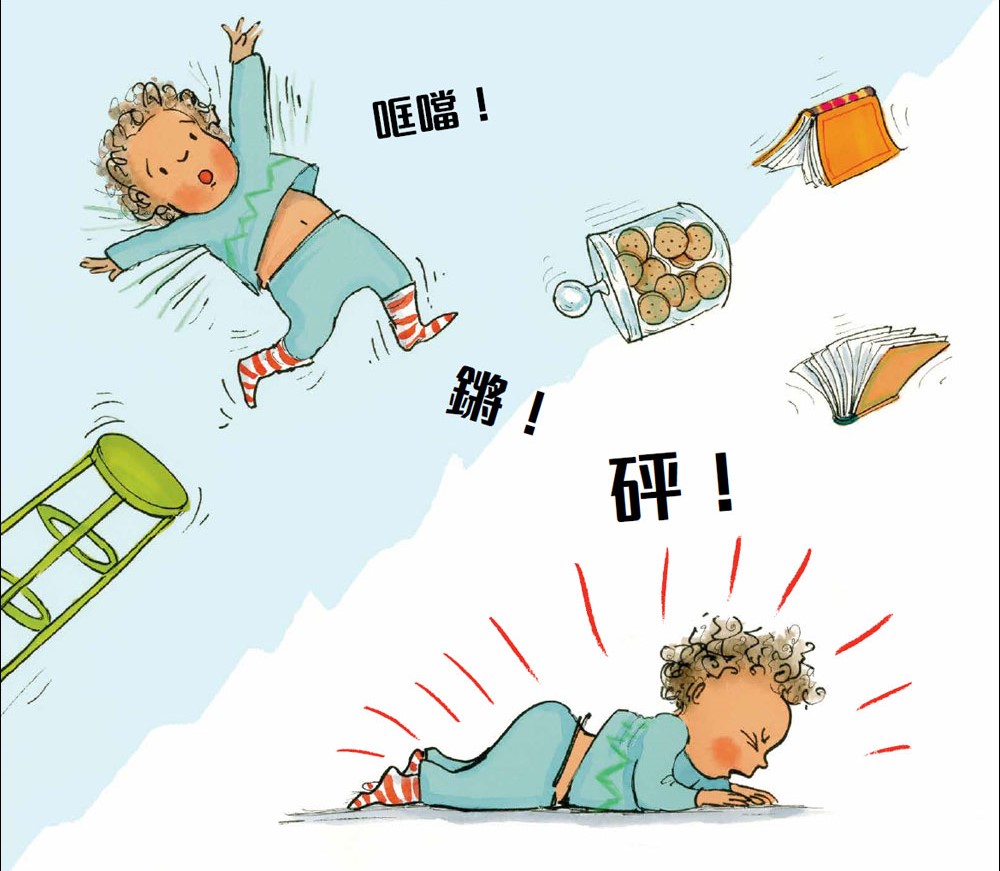 故事裡的主角,因為很想拿到高處的餅乾、卻摔在地上、又接連發生許多不順利,感到挫折、失望而大叫、發怒時,閱讀時,可以帶孩子觀察,一同描述看看,主角臉上表情、身體動作、姿勢,在接近生氣時是什麼樣子呢?另一位角色是如何回應呢?主角又是如何平靜下來的?平靜下來後的表情、身體動作,又是如何變化的?